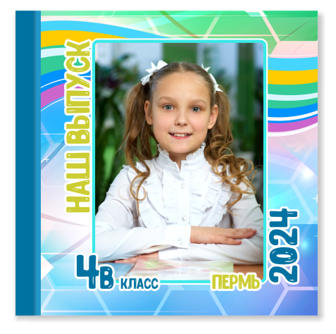 Полиграфическая фотокнига в компактном квадратном формате 20х20 см. Яркий, но в то же время неагрессивный дизайн. На основе этого шаблона получится замечательный выпускной фотоальбом для начальной школы.